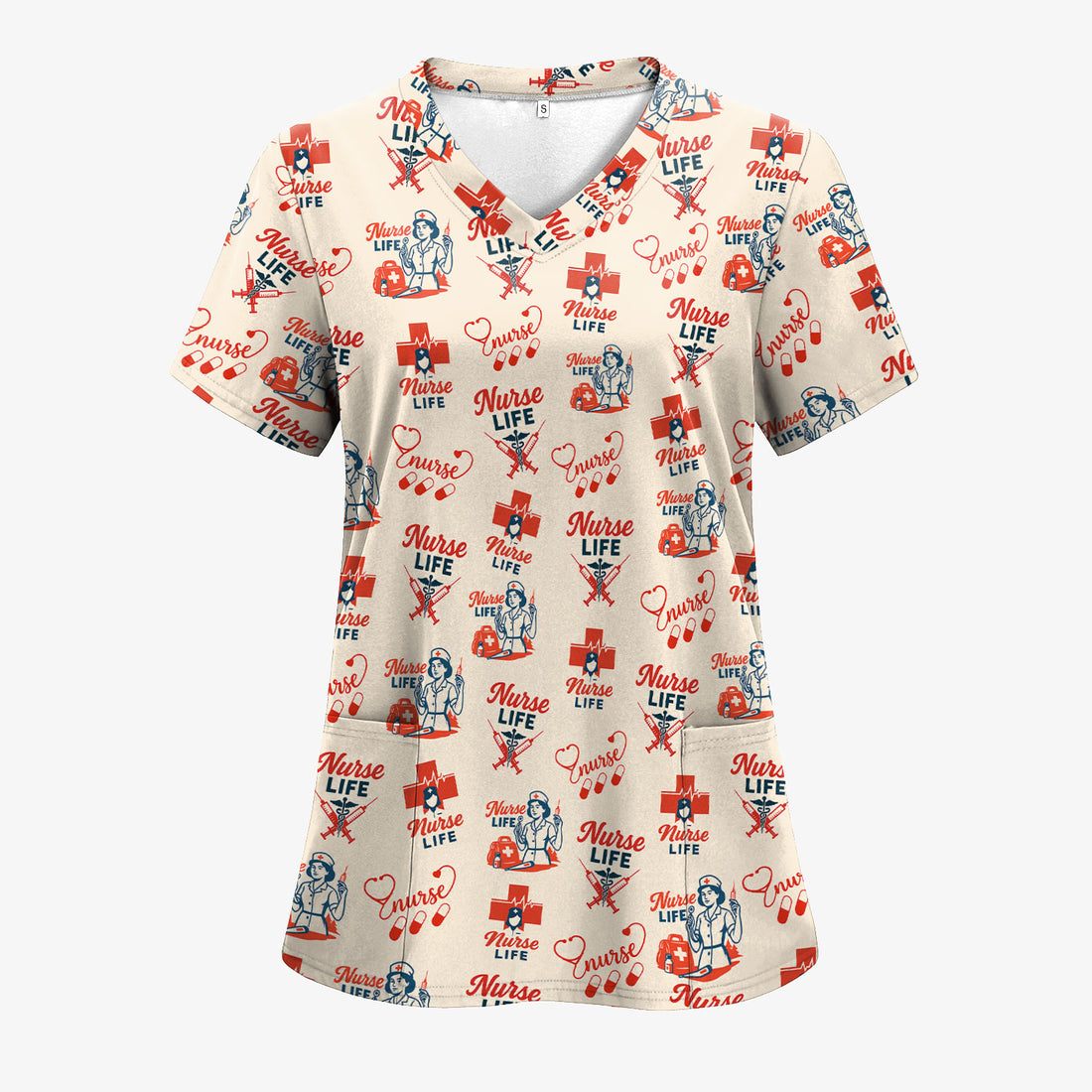 Personalized Vintage Nurse Life Scrub Top - Retro Medical Icons Pattern Design - Gift for RN LPN BSN Women