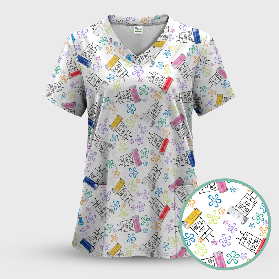 Doodle Bob Energy Drink Nurse Scrub Top - Cute Cartoon Medical Design - RN MD CNA RT Paramedic Healthcare Gift