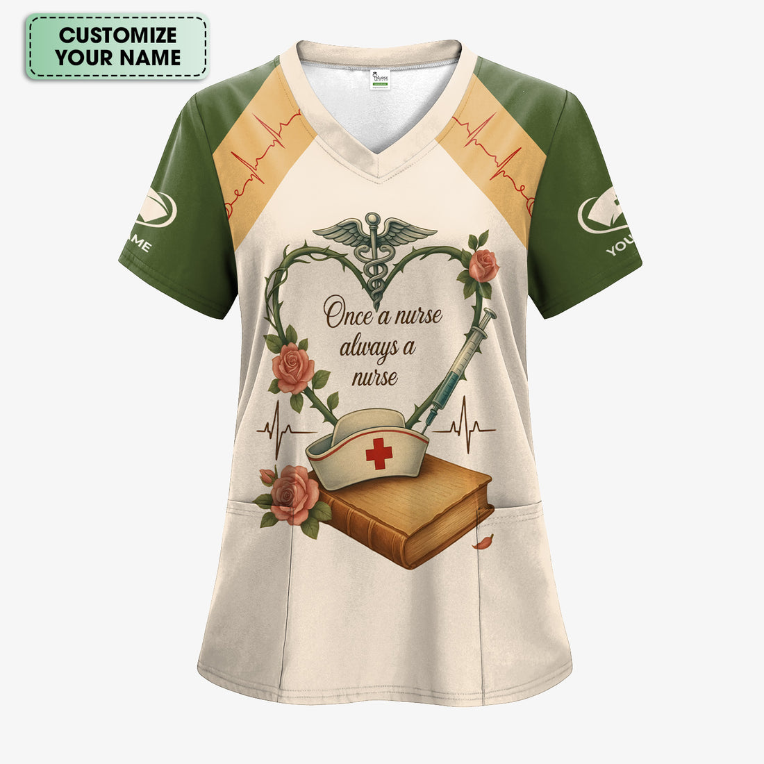 Personalized Nurse Scrub Top - Once a Nurse Always a Nurse Quote - Gift for RN LPN CNA Nursing Staff
