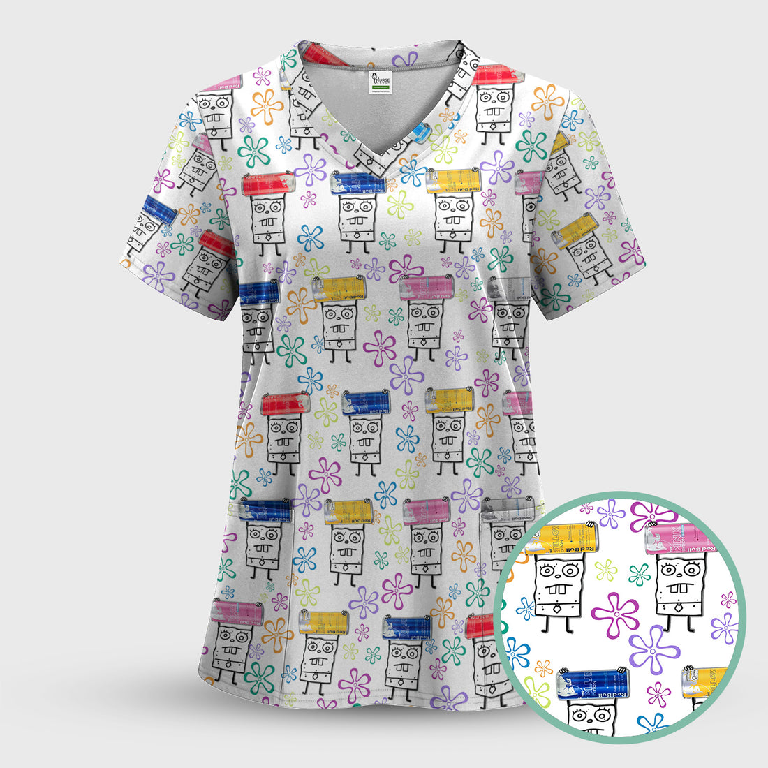Custom Doodle Bob Energy Drink Nurse Scrub Top - Funny Cartoon Medical Design - Gift for RN MD RT CNA Paramedic Healthcare Staff