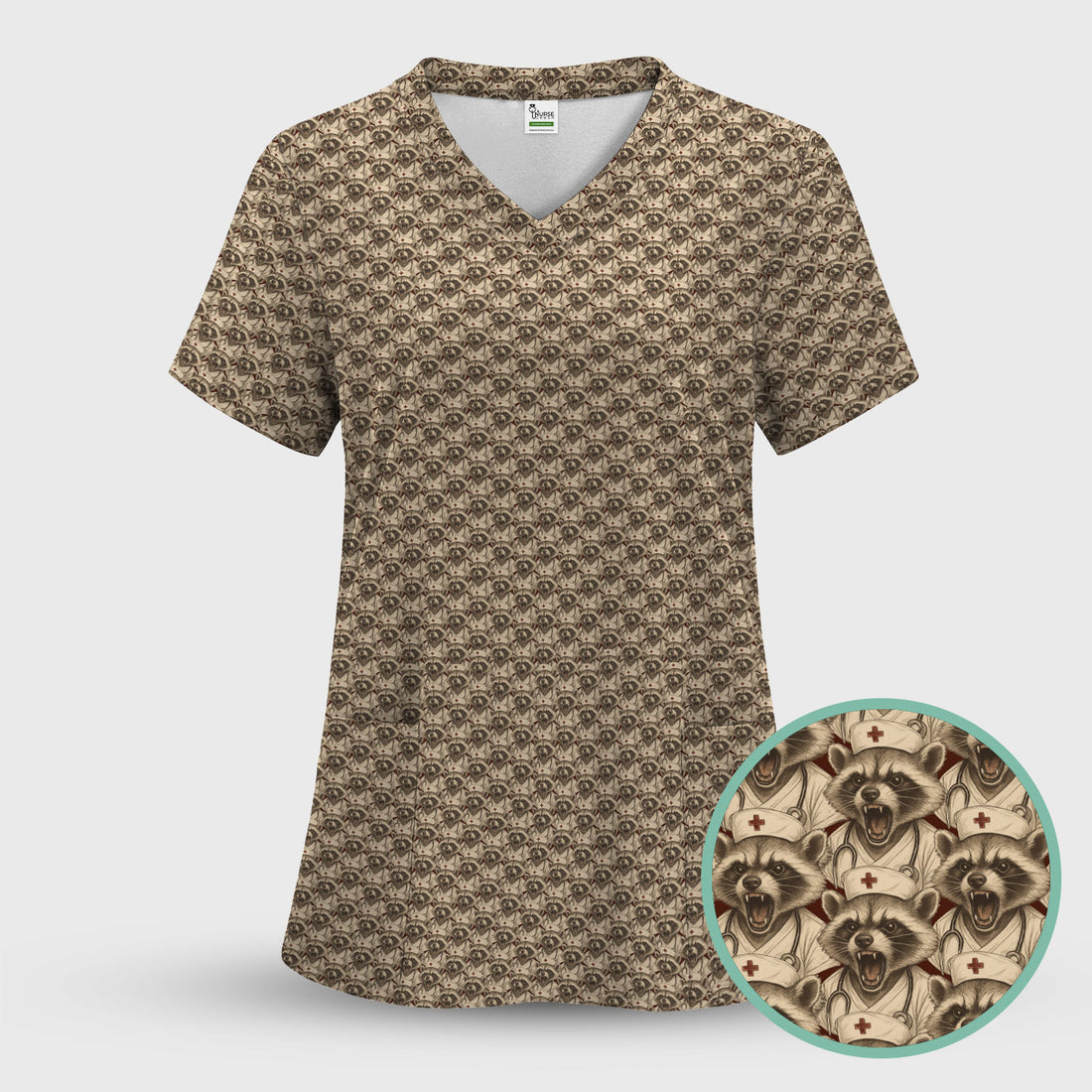 Funny Nurse Raccoon Scrub Top - All-Over Print Angry Raccoon Face Pattern - Gift for Women RN, LPN, CNA