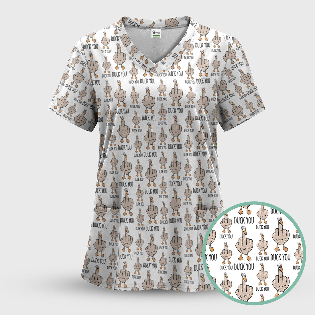 Personalized Sarcastic Duck You Scrub - Funny Duck & Middle Finger Top for Nurse - Gift for Women RN LPN CNA