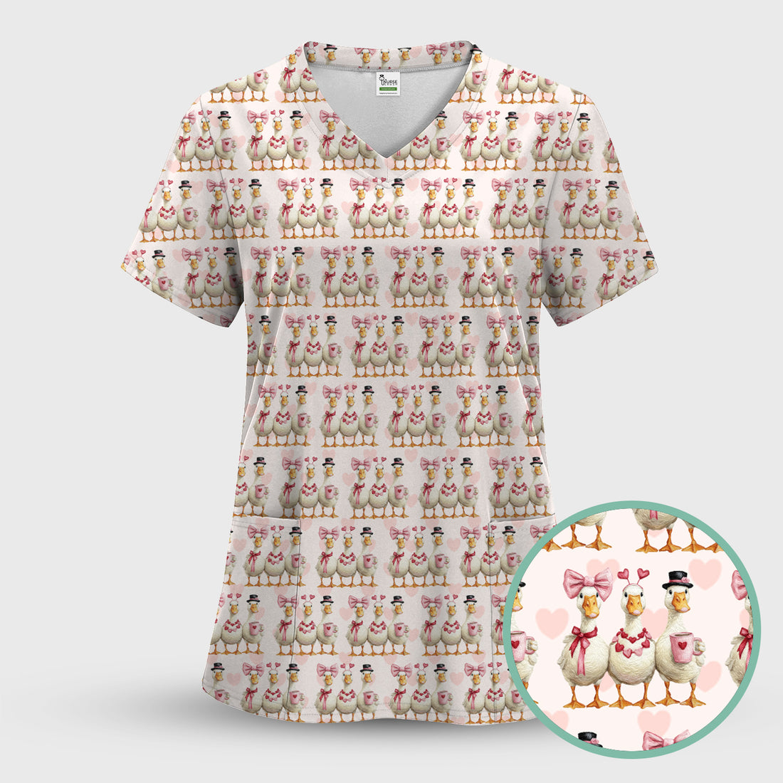 Charming Valentine Goose Heart Pink Design Scrub Top, Comfortable Scrubs for Nurses