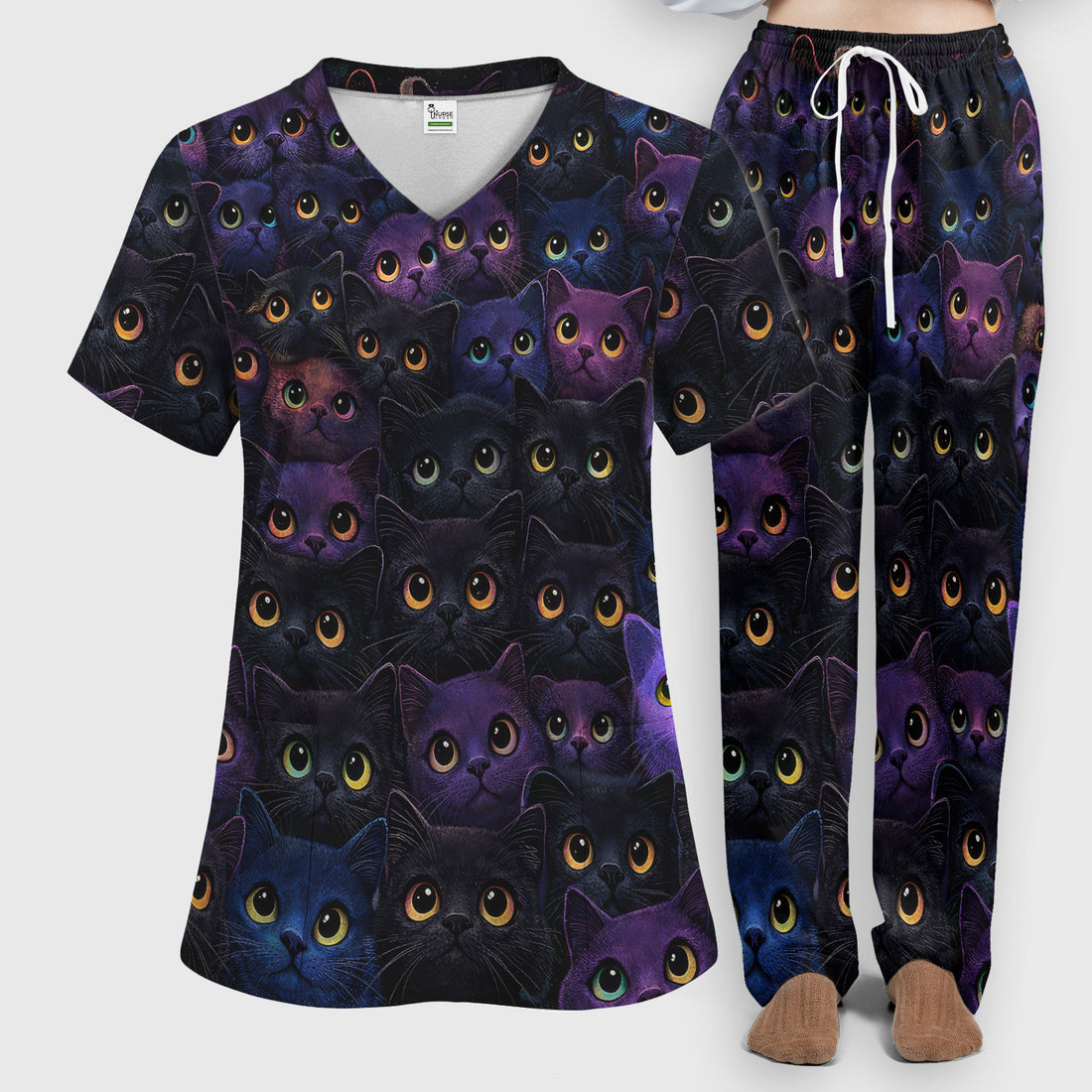 Love these scrubs! The cat design is adorable and totally unique. I've washed mine a few times already, and the colors still look bright. They're comfy, funny, and perfect for cat lovers like us.