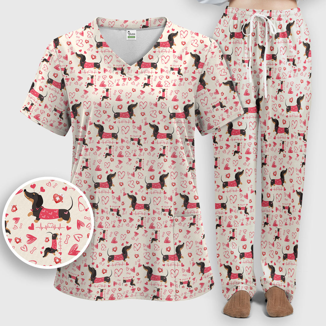 Dachshund Valentine Scrub Set, Cute Wiener Dog Heart Pattern Nurse Shirt, Breathable Fabrics Nursing Uniform