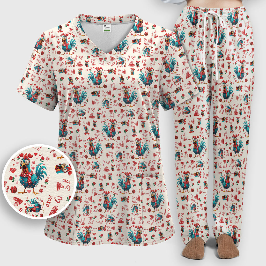 Funny Rooster Valentine Scrub Set, Cute Chicken XOXO Heart Pattern Nurse Shirt, Breathable Fabrics Nursing Uniform
