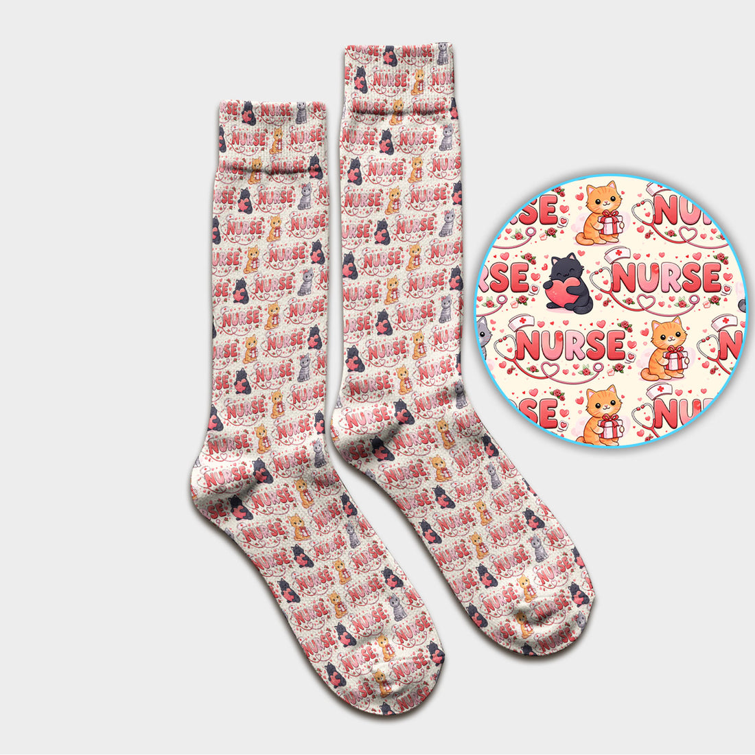 Nurse Cat Heart Pattern Valentine Socks, Socks for Nurse Doctor Adult