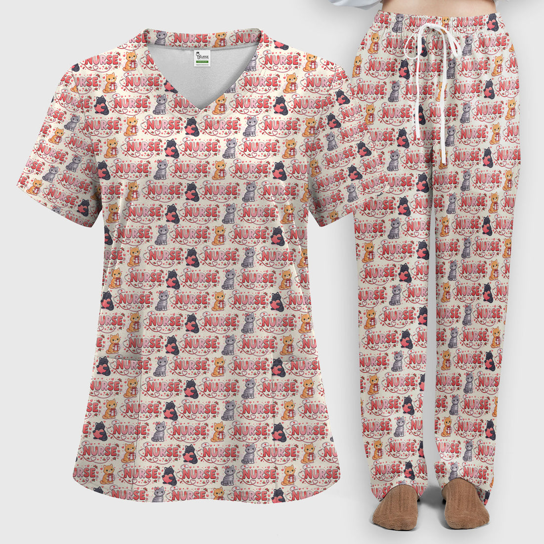 Nurse Cat Heart Pattern Valentine Scrub Set, Women's Scrub Sets V Neck Top