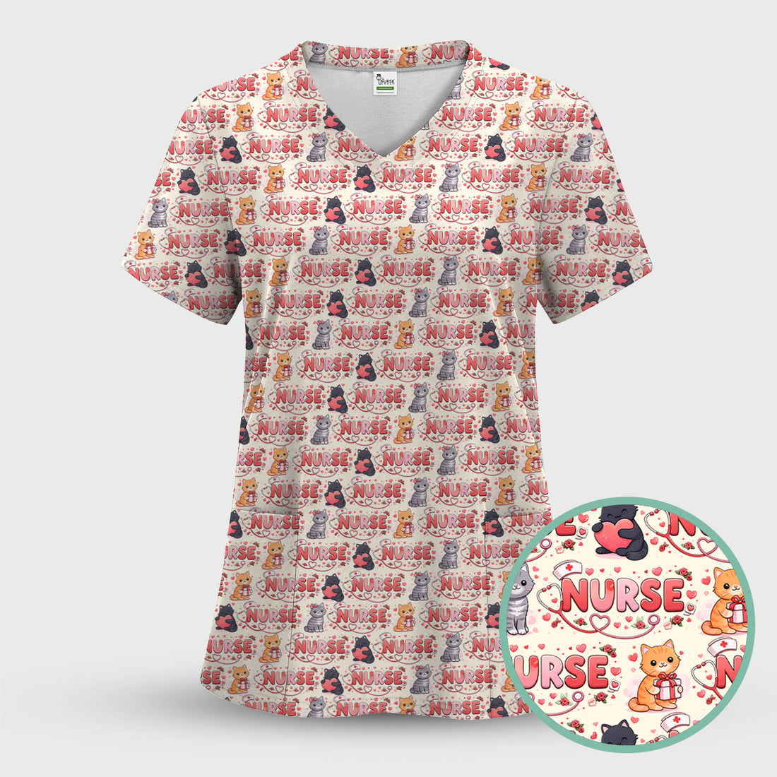 Nurse Cat Heart Pattern Valentine Scrub Top, Comfortable Scrubs for Nurses
