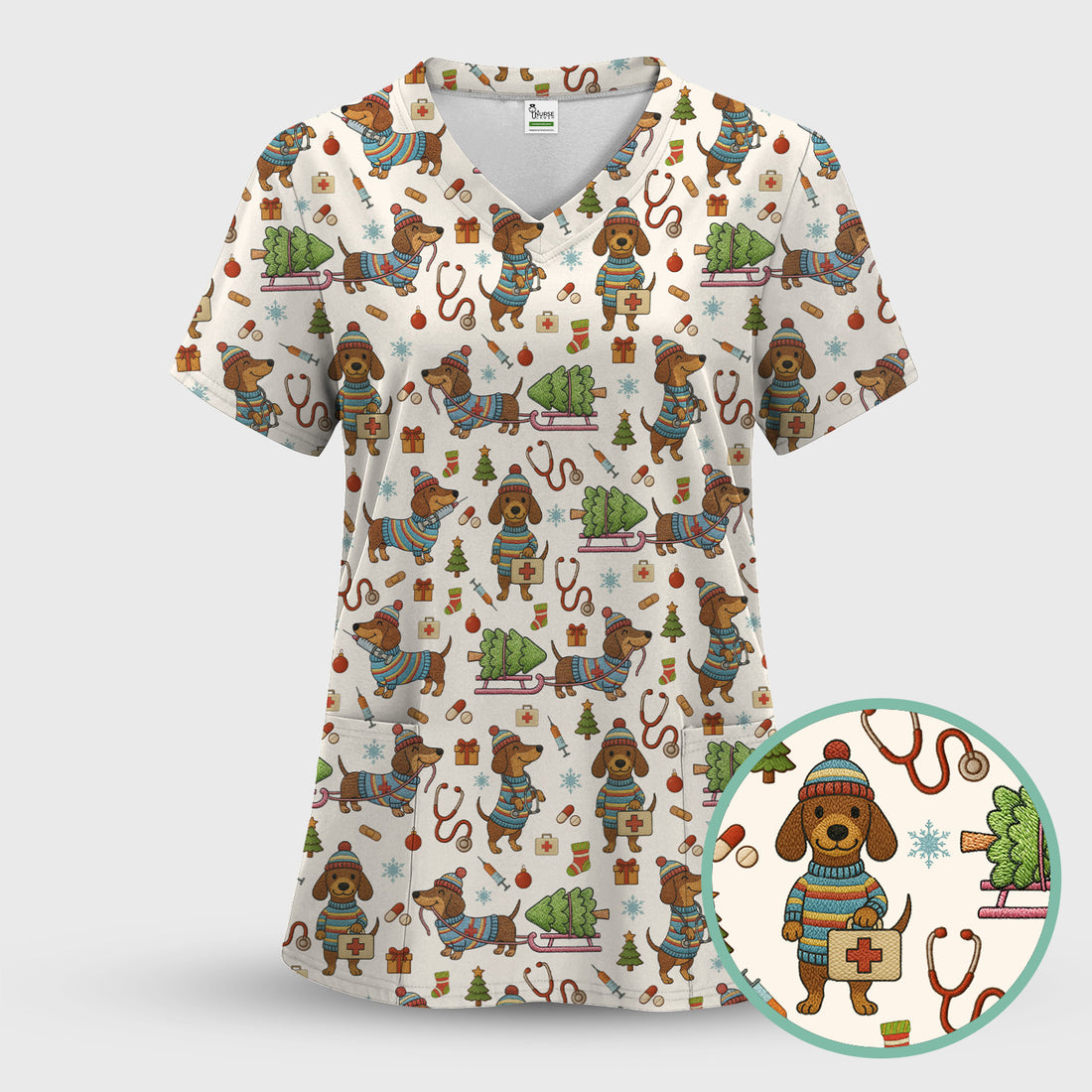 Holiday Dachshund Christmas Scrub Top - Funny Wiener Sausage Dog Nurse Shirt - Adorable Dog Lover Gift for RN CNA LPN