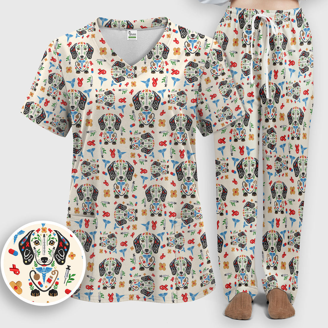 Funny Dachshund Nurse Scrubs Set - Cute Dog Print Medical Shirt - Holiday Nurse Scrub Top Gift for RN CNA Doctor, Women & Men