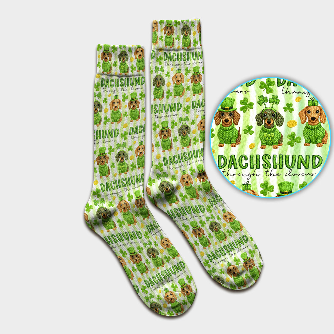 Wiener Dog St. Patrick’s Day Scrub Socks, Shamrock Dachshund Pattern Nurse Sock, Breathable Fabrics Nursing Uniform