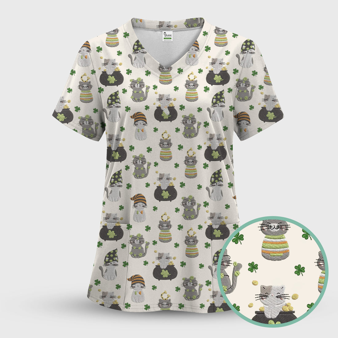 St. Patrick’s Day Scrub Top, Lucky Cat With Shamrock Pattern Shirt, Breathable Fabrics Nursing Uniform