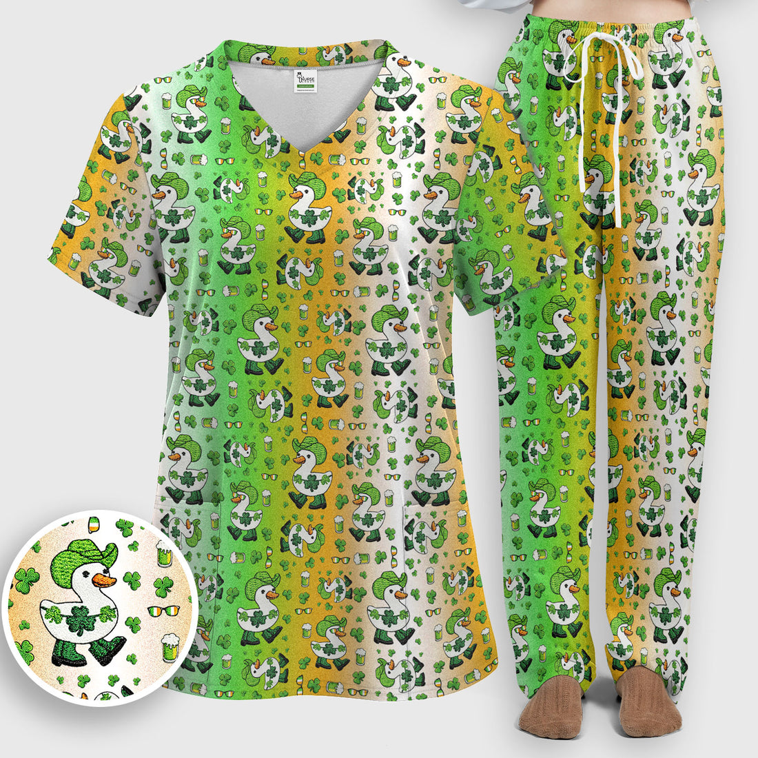 St. Patrick Goose Shamrock Medical Pattern Scrub Set, Breathable Med Uniform
