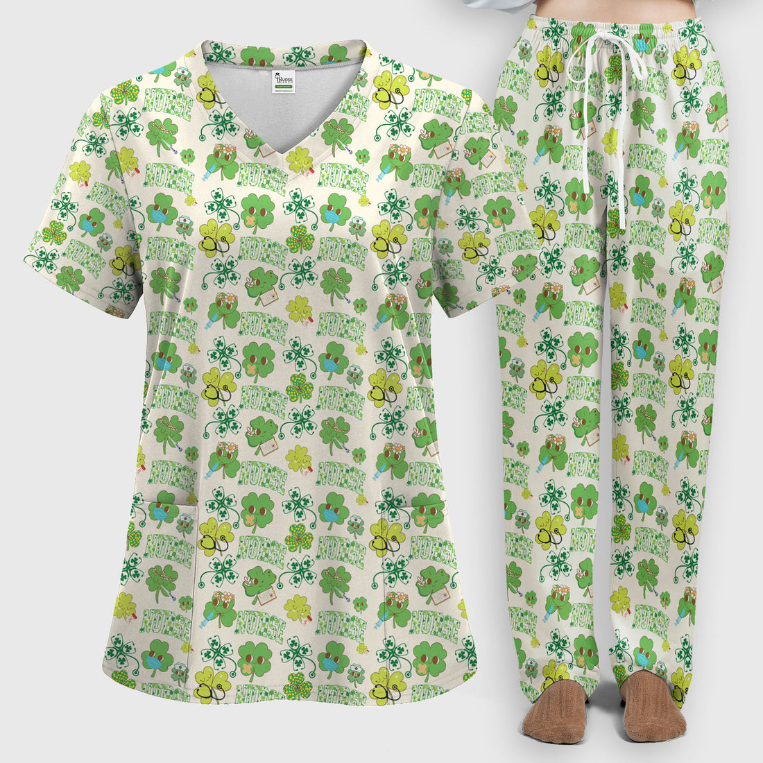Lucky Shamrock Nurse Scrub Set, St. Patrick’s Day Nursing Shirt, Breathable Fabrics Nursing Uniform