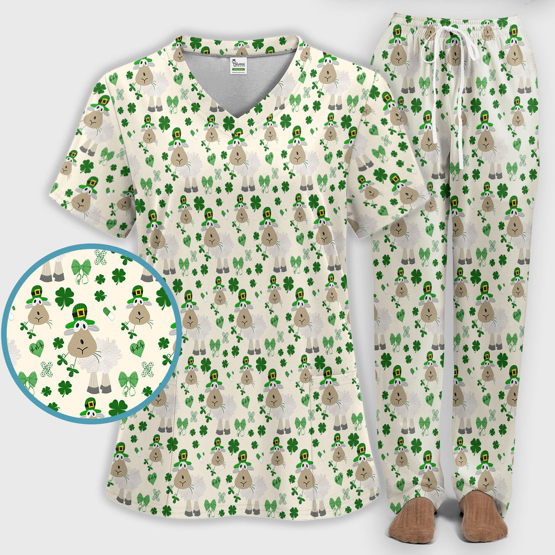 Nurse St. Patrick Scrubs Set, Cute Sheep Shamrock Pattern Nurse Shirt, Breathable Fabrics Nursing Uniform
