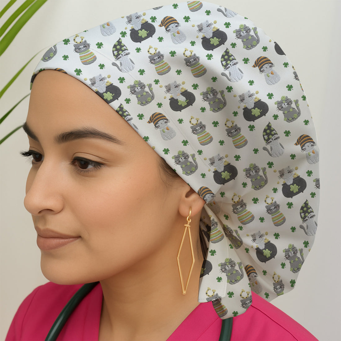 St. Patrick’s Day Scrub Cap, Lucky Cat With Shamrock Pattern Hat, Breathable Fabrics Nursing Uniform