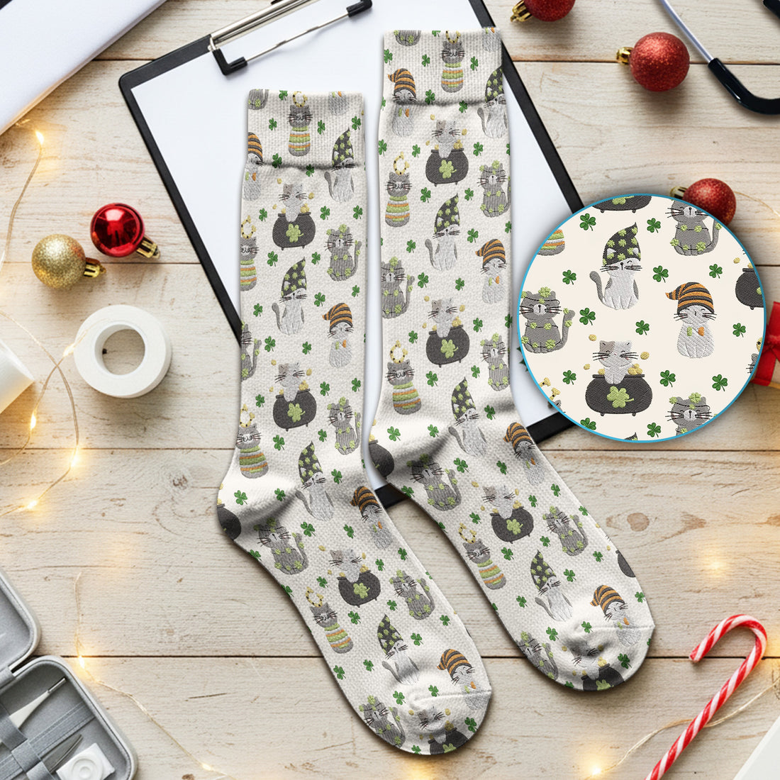 St. Patrick’s Day Scrub Socks, Lucky Cat With Shamrock Pattern Sock, Breathable Fabrics Nursing Uniform