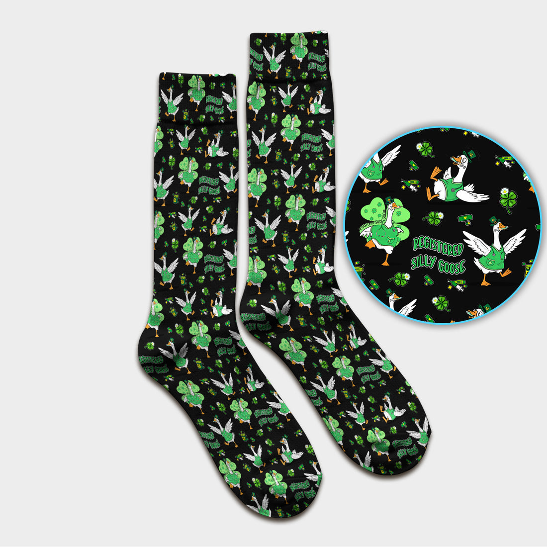 Silly Goose St. Patrick’s Day Scrub Socks, Funny Goose Shamrock Pattern Nurse Scrub Sock, Irish Green Nursing Uniform