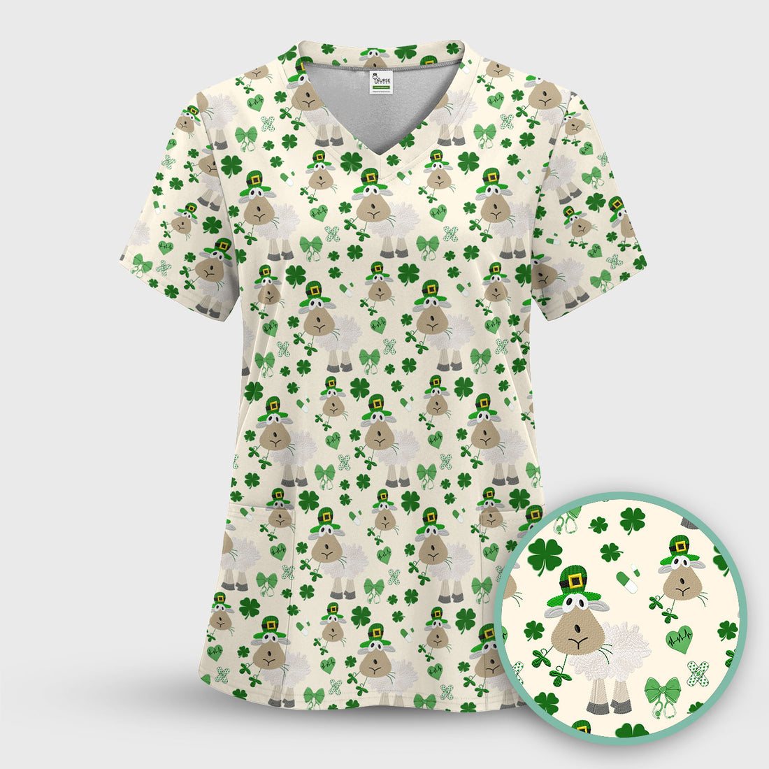 Nurse St. Patrick Scrubs Top, Cute Sheep Shamrock Pattern Nurse Shirt, Breathable Fabrics Nursing Uniform