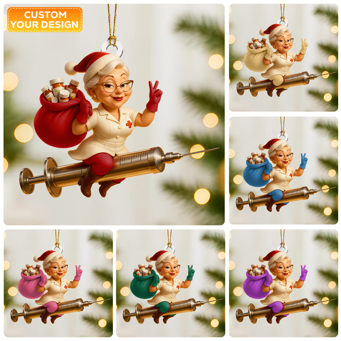 Funny Nurse Christmas Ornament, Custom Healthcare Worker Ornament, Santa Nurse Riding Syringe, Unique RN Xmas Gift