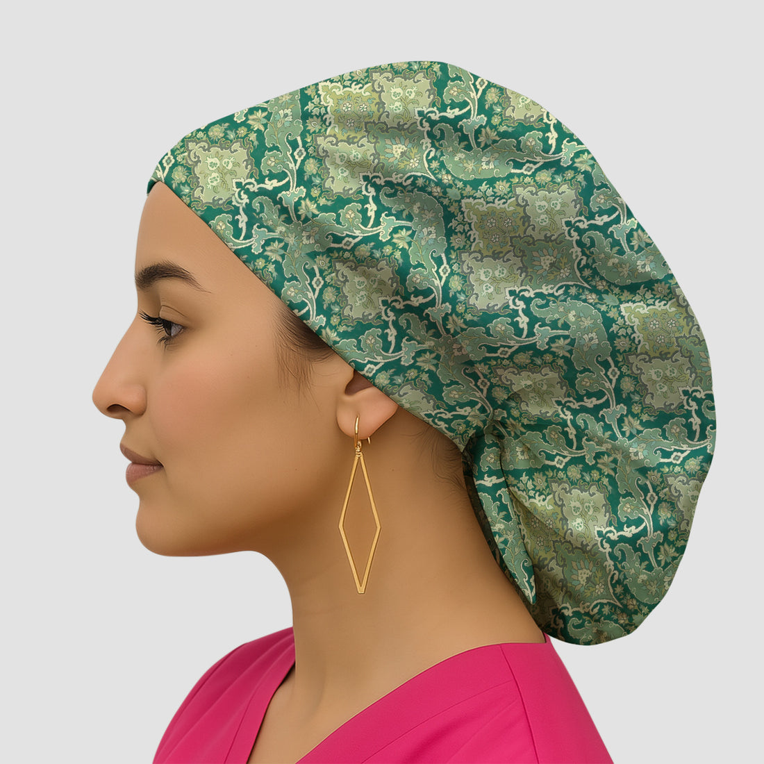 Green Vintage Damask Ornamental Pattern Scrub Cap, Breathable Fabrics Caps Uniform