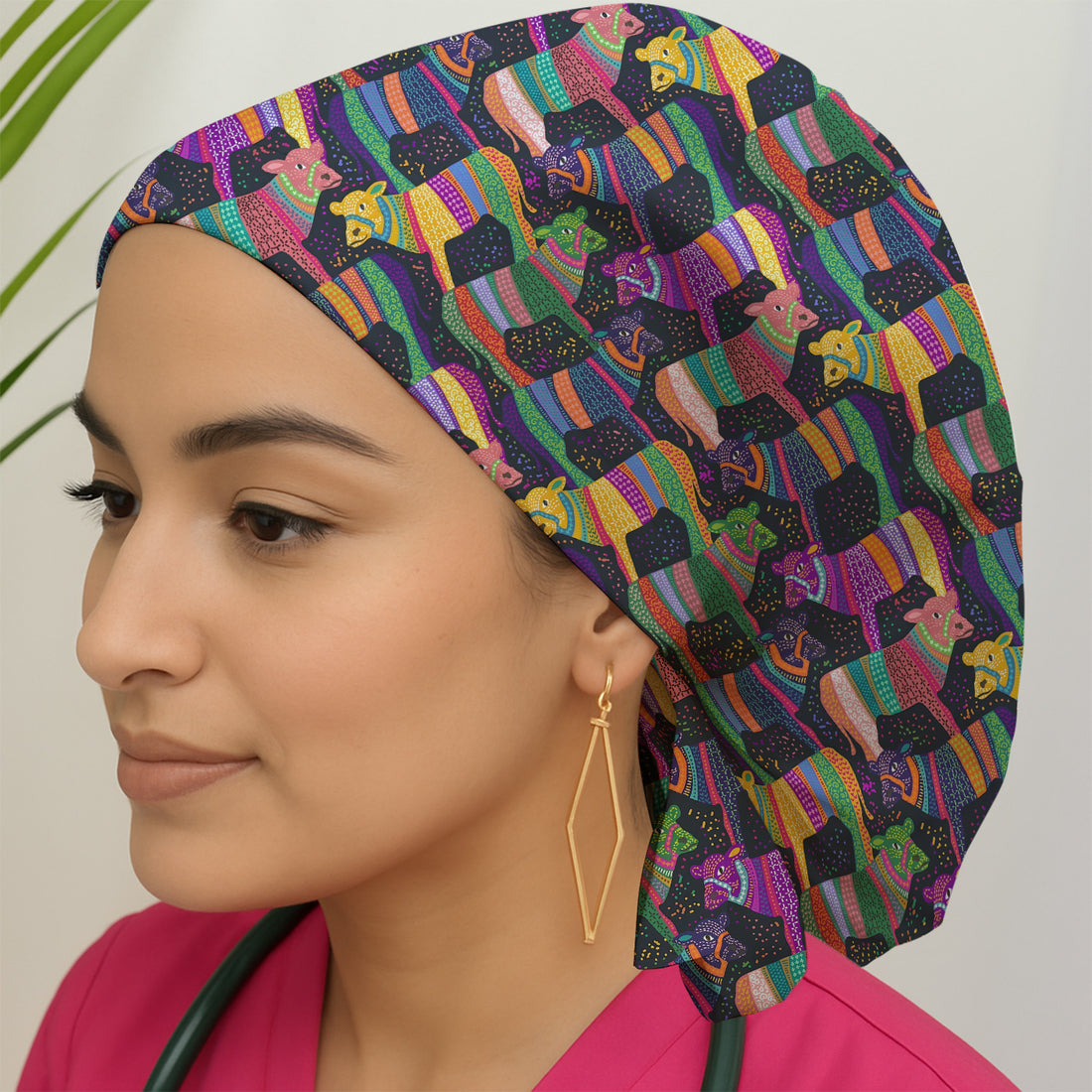 Vibrant Patchwork Rainbow Cow Pattern Scrub Cap, Breathable Fabrics Caps Uniform