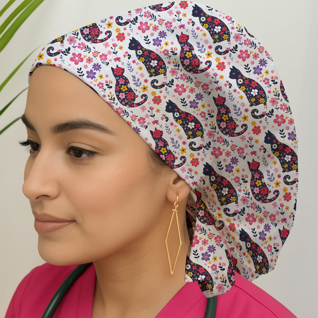 Floral Cat Silhouette Spring Garden Pattern Scrub Cap, Breathable Fabrics Caps Uniform