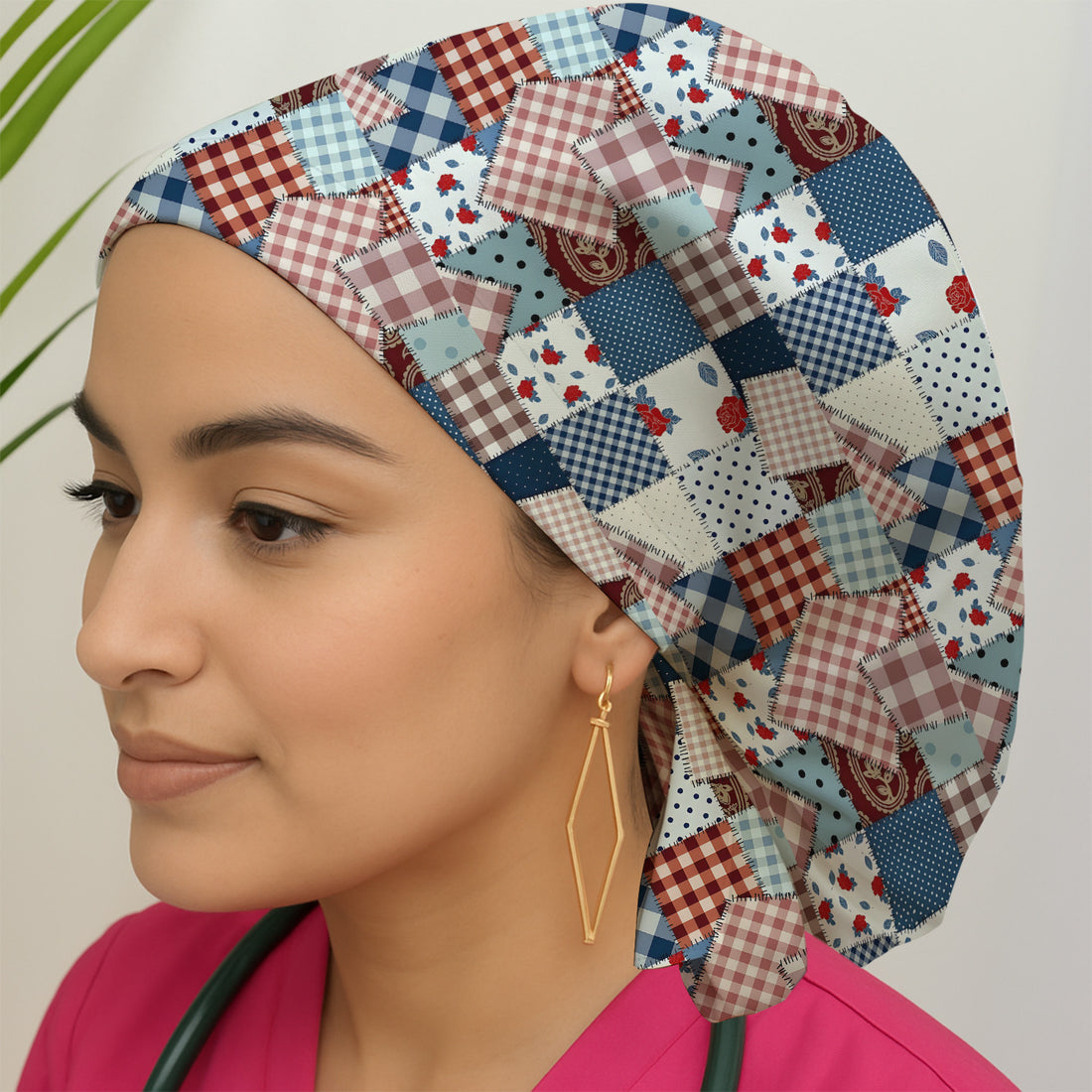 Retro Patchwork Plaid Quilt Pattern Scrub Cap, Breathable Fabrics Caps Uniform