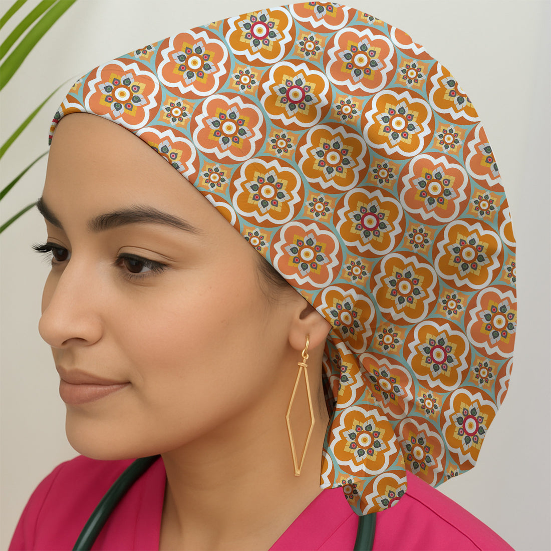 Orange Retro Geometric Floral Pattern Scrub Cap, Breathable Fabrics Caps Uniform