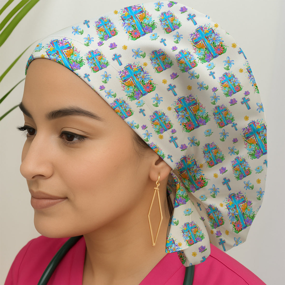 Christian Floral Cross Spring Pattern Cap, Bouffant Scrub Caps for Women