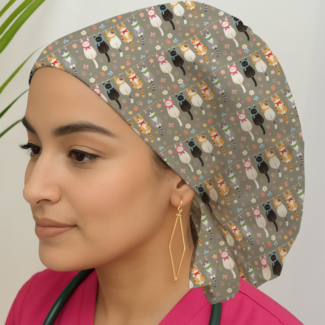 Cute Cat Clothesline Pattern Cap, Bouffant Scrub Caps for Women