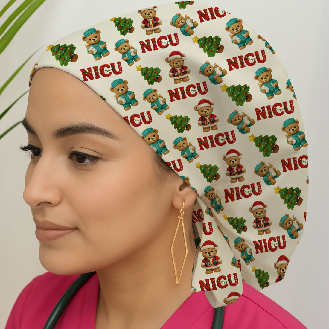 Festive Christmas NICU Nurse Teddy Bear Pattern Print Cap, Bouffant Scrub Caps for Women
