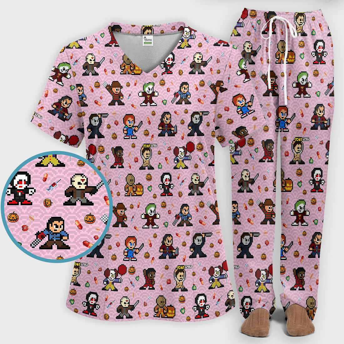 Halloween Women's Scrub Sets - Comfortable Scrubs for Nurses - Scary Character Scrub Pants and V Neck Top - Med Uniform for Her