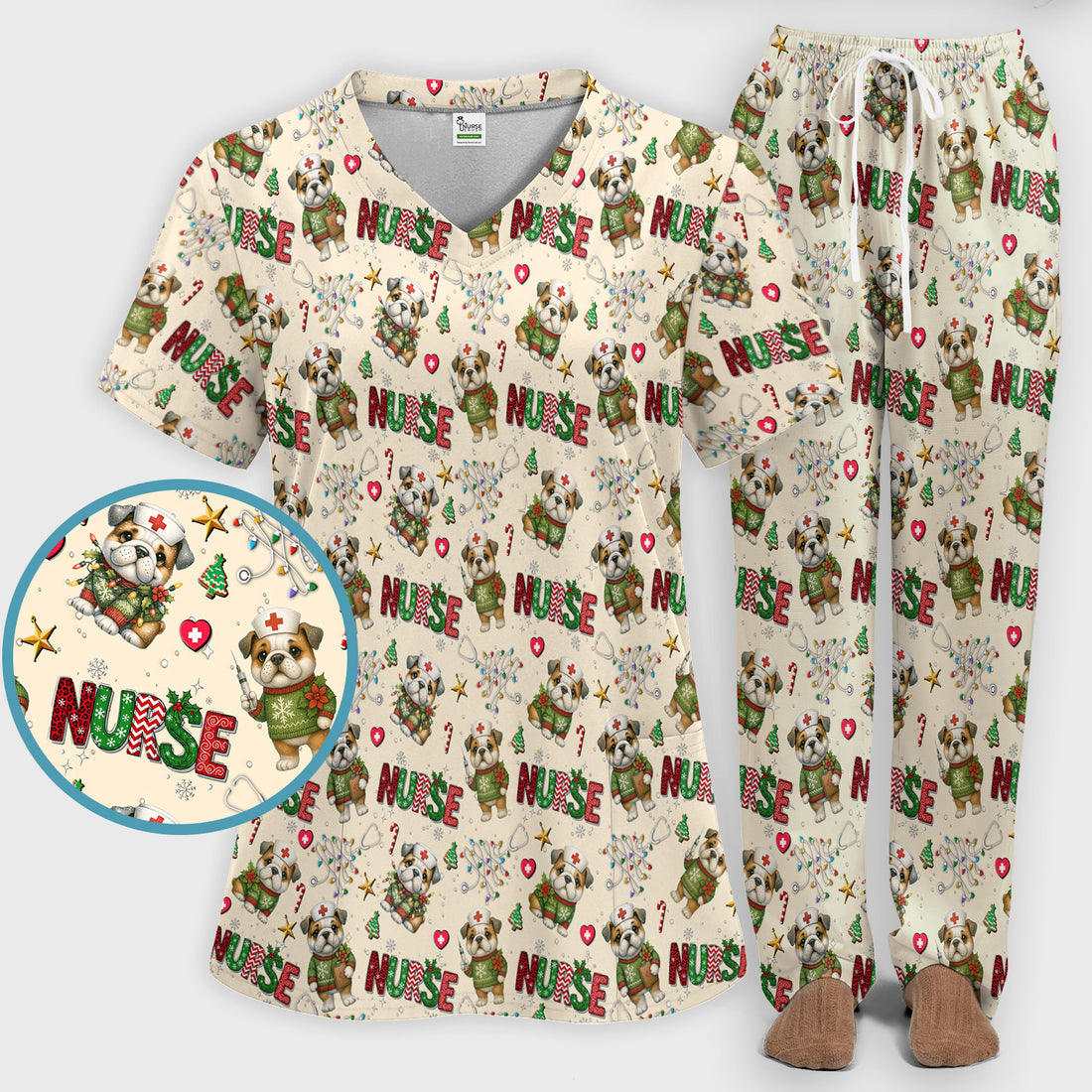 Bulldog Christmas Nurse Scrub Set - Funny Dog Scrubs Pants and V Neck Top - Cute Holiday Medical Uniform