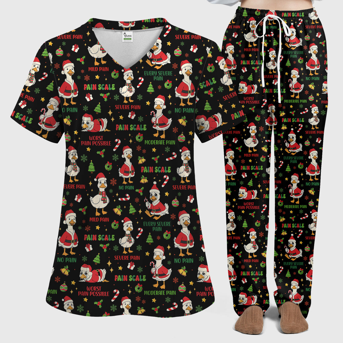 Funny Goose Christmas Scrub Set - Pain Scale Scrubs Pants and V Neck Top - Cute Holiday Medical Uniform for Women