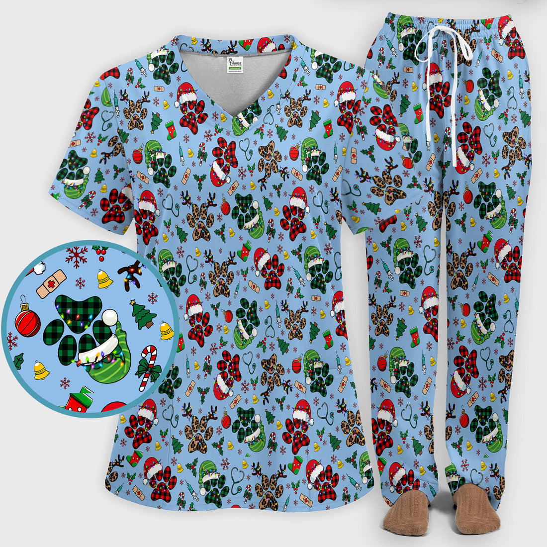 Christmas Paw Print Scrub Set for Nurses - Cute Leopard Holiday Pants and V Neck Top - Funny Pet Medical Uniform Gift