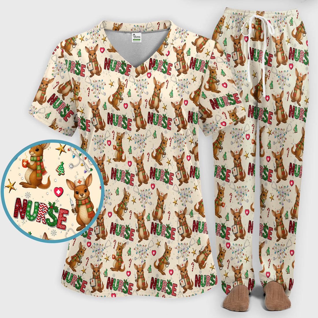 Aussie Kangaroo Christmas Scrub Set - Funny Holiday Nurse Shirt and Pants for Women - Cute Animal Medical Uniform