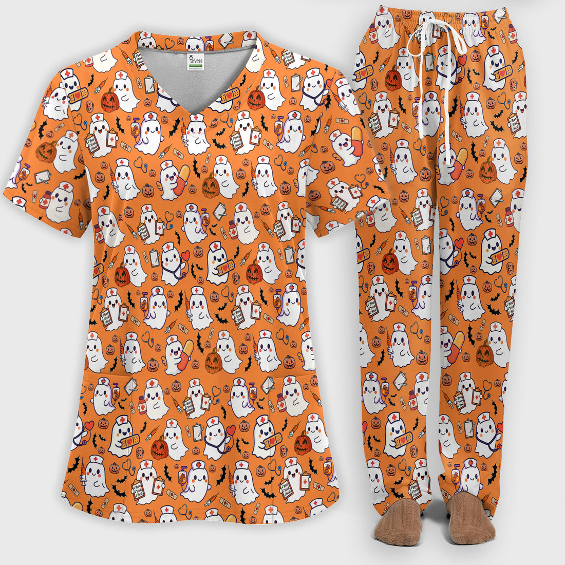 Women's Scrub Sets Halloween Gift - Comfortable Scrubs for Nurses - Pumpkin Ghost Scrub Pants and V Neck Top