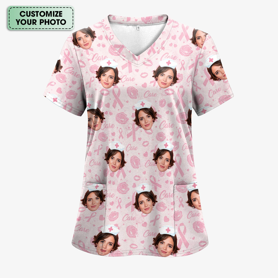 Personalized Nurse Scrub Top with Custom Face - Pink Ribbon Breast Cancer Awareness - Gift for RN LPN CNA Women Healthcare Staff
