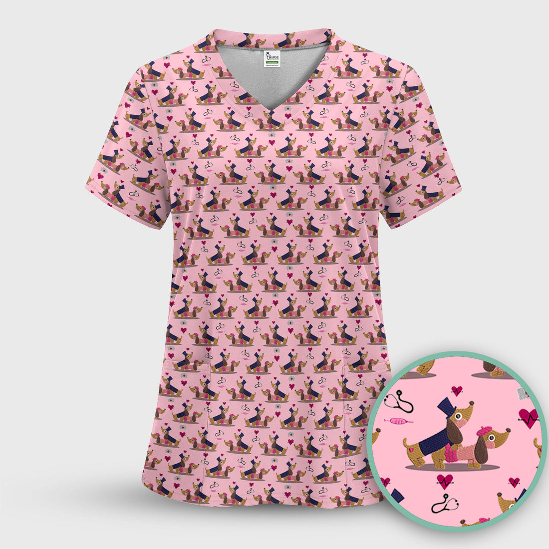 This scrub is adorable! The dachshund print is so fun and bright, and the pink color really stands out. The fit is perfect and the material feels soft but durable. Even my pediatric patients get excited when they see it.