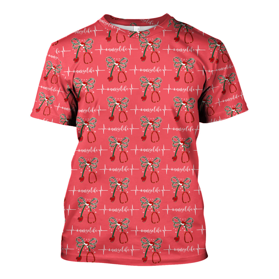 Festive Nurse Life Christmas Shirt - Christmas Stethoscope & Heartbeat Graphic Tee - Gift for RN LPN CNA Healthcare Staff