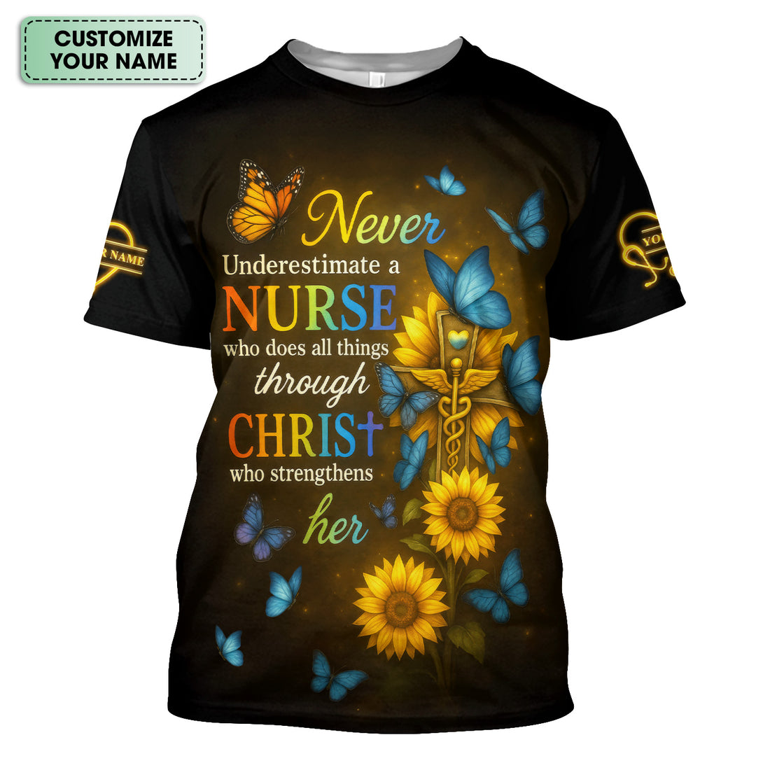 Custom Faith Nurse Sunflower Shirt - All Things Through Christ & Butterfly Cross Graphic - Gift for Women RN LPN & Medical Students