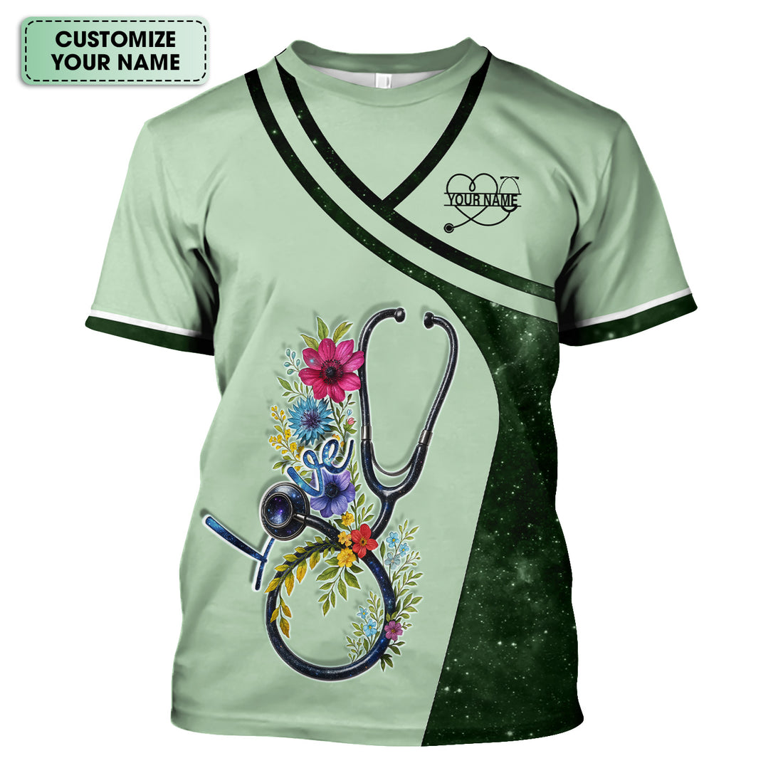 Custom Nurse Love T-Shirt - Floral Stethoscope & Galaxy Design - Personalized Gift for RN LPN CNA Healthcare Professionals