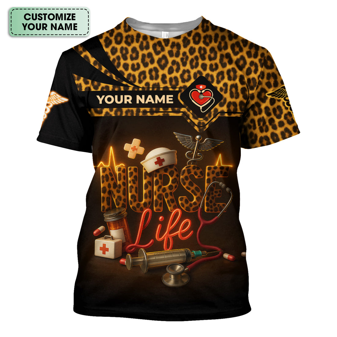 Personalized Nurse Life Shirt - Wild Cheetah Print with Medical Icons - Custom Name Gift for RN, CNA, LPN
