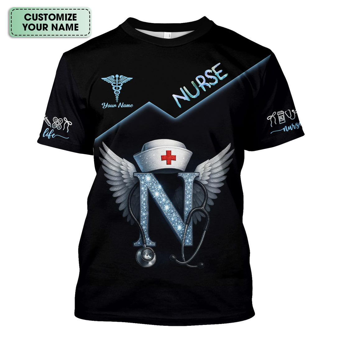 Funny Nurse T-shirt with Glowing 'N' Design - Customizable with Stethoscope & Wings Design - Perfect for RN, CNA, LPN, Healthcare Professionals