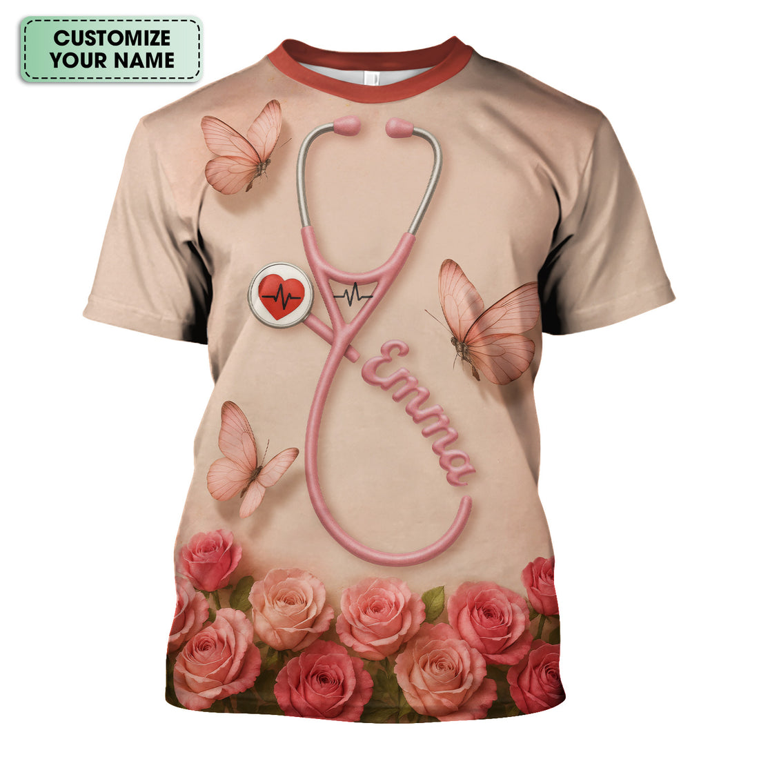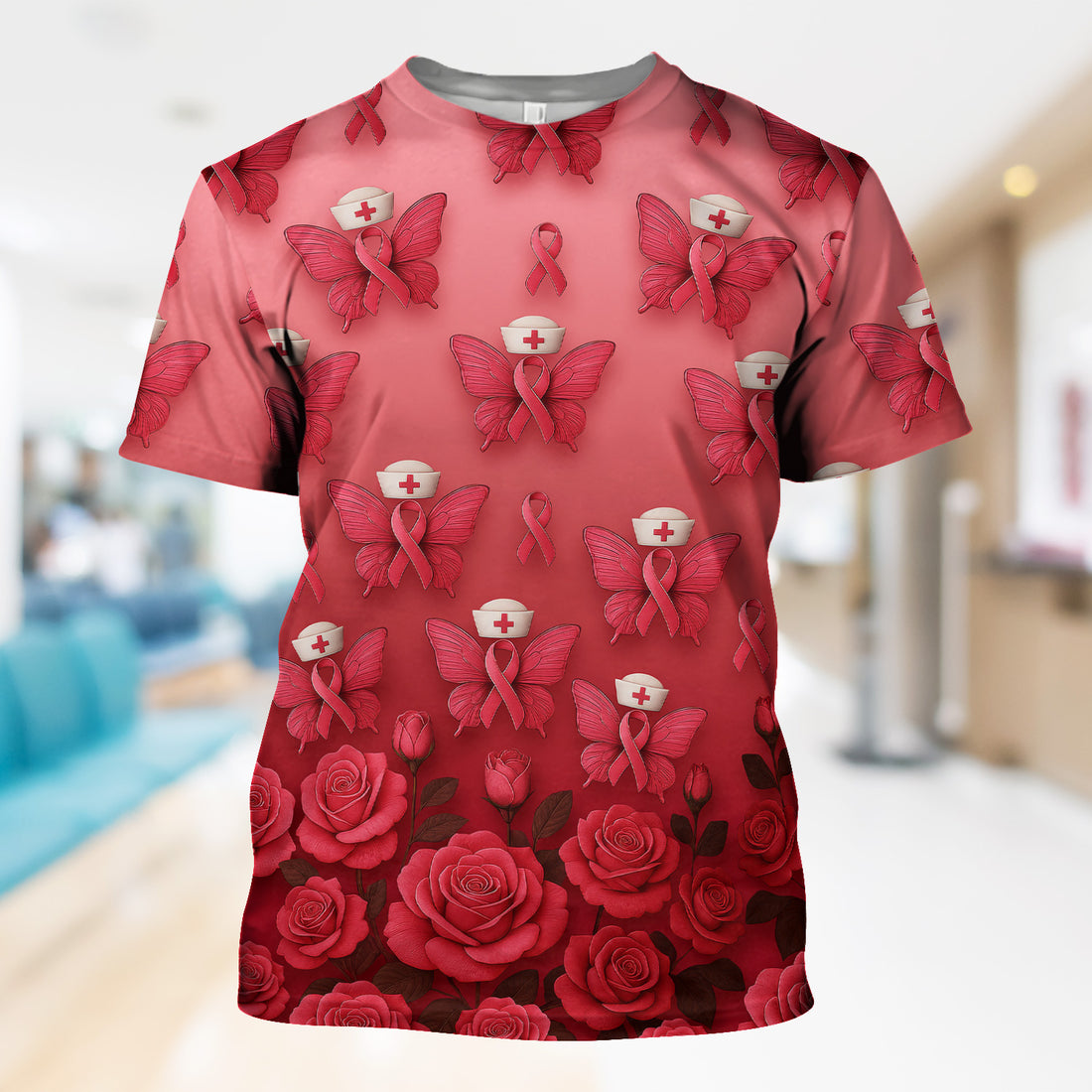 Custom Breast Cancer Awareness Nurse Shirt - Pink Ribbon Butterfly Nurse & Rose Floral Design - RN LPN CNA Gift
