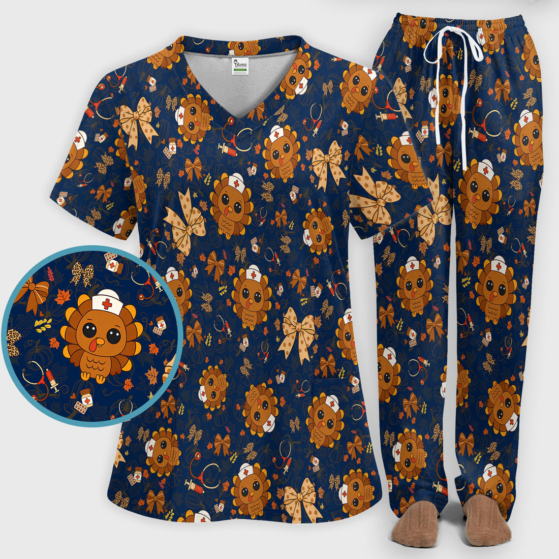 Thanksgiving Comfortable Scrubs for Nurses - Funny Autumn Turkey Shirt - Breathable Fabrics Nursing Uniform