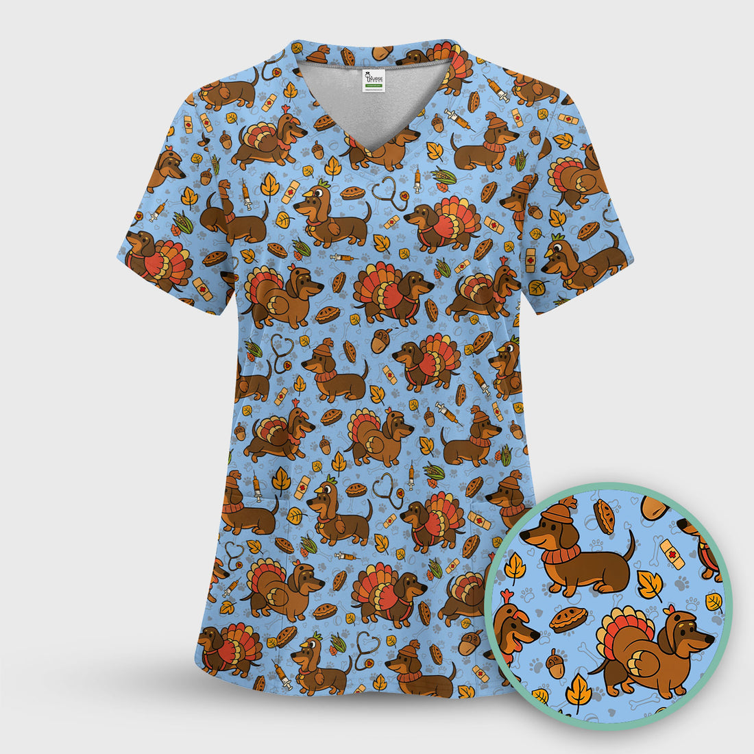 Thanksgiving Dachshund Scrubs Top - Cute Dog Turkey Medical Uniform Shirt for Nurses - Funny Holiday Gift