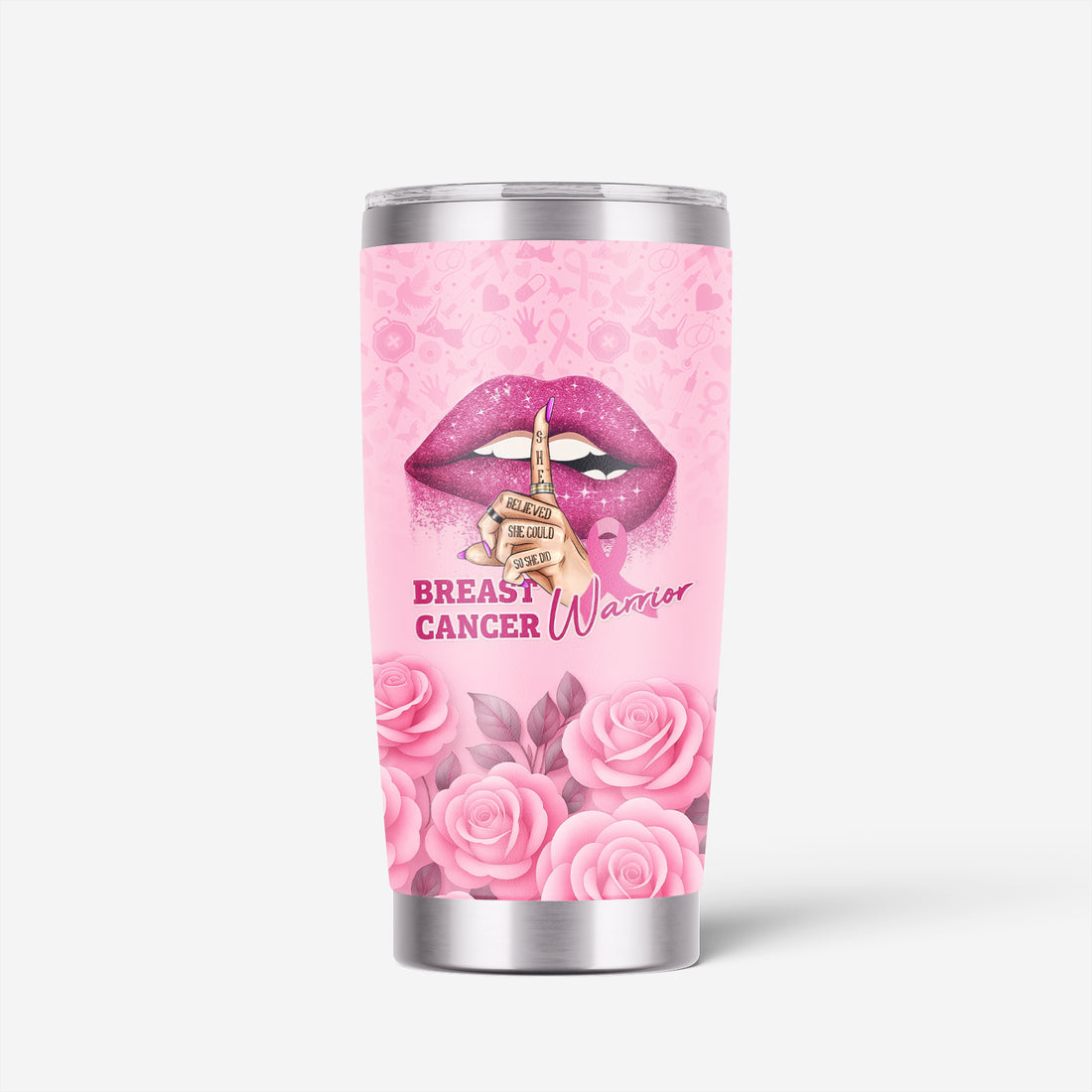 Personalized Breast Cancer Warrior Tumbler - She Believed She Could Pink Ribbon Design - Gift for Women RN LPN CNA